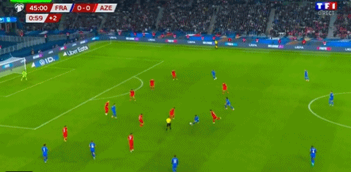 第25分钟,法国获得角球,奥利塞选择直接旋向球门,马哈马达利耶夫飞身单掌将球托出横梁。第43分钟,埃基蒂克潇洒人球分过杀入禁区,小角度劲射打得太正,被阿塞拜疆门将没收。
